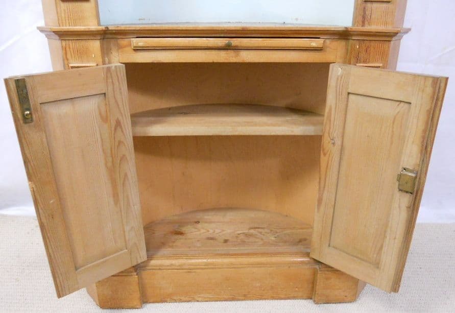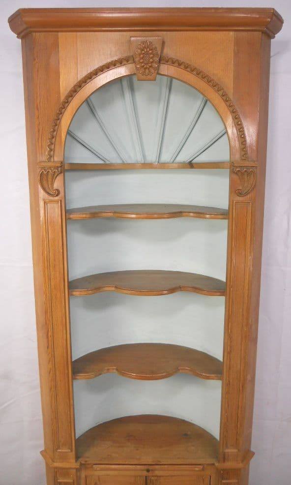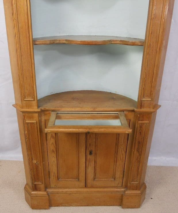 Attractive, Georgian style tall standing pine corner cupboard. Having open upper section, with display shelves. Lower twin opening cupboard doors, offering useful storage space.